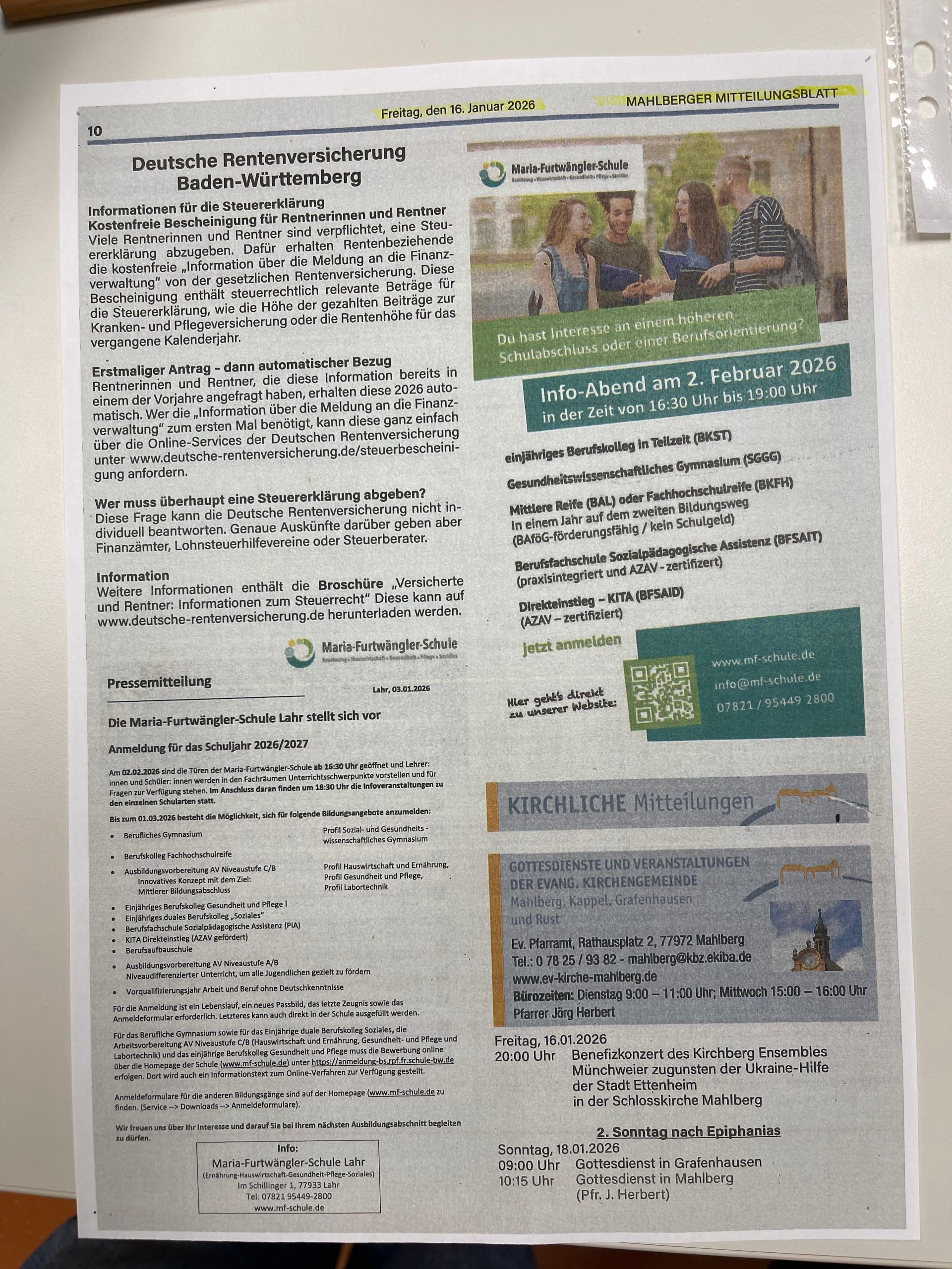 - Maria-Furtwängler-Schule Lahr, Gemeindemitteilungsblatt Schwanau vom 19. Januar